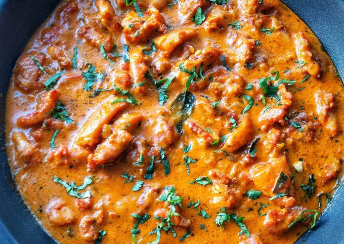 - Then add the cream and cook for 5- 10 min and then add kasuri methi and add fried chicken and add some water and cook til it thickens.Then add a dollop of butter and close and cook for while.Garnish with coriander leaves..